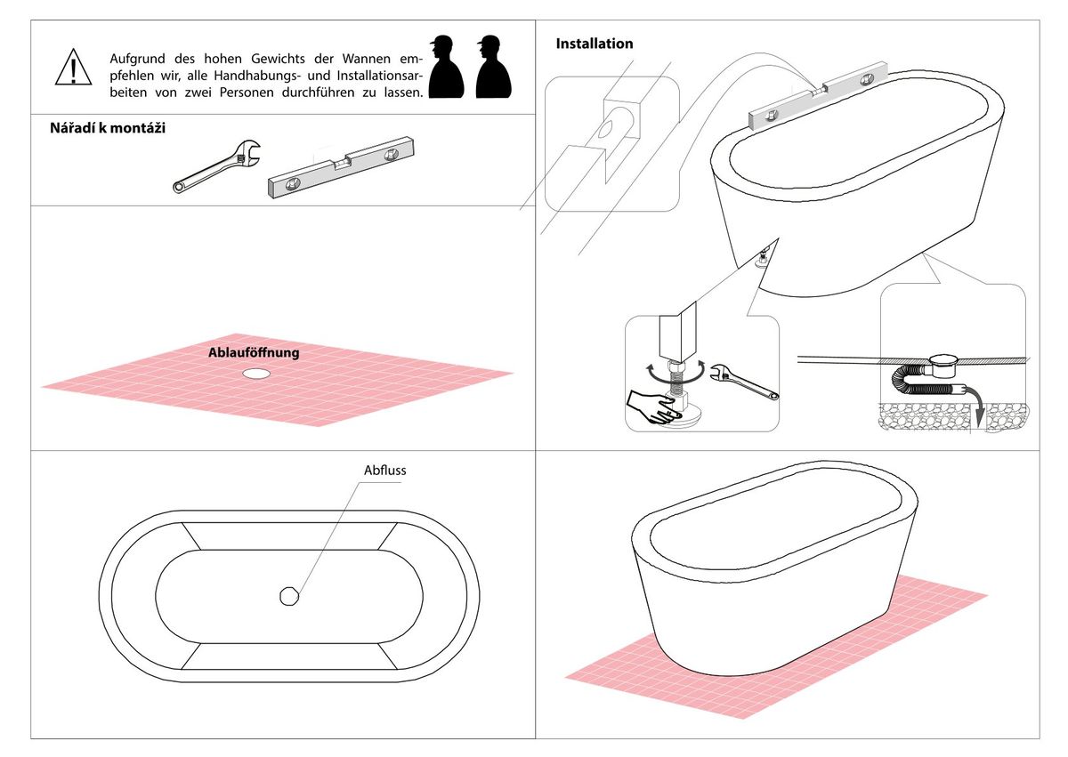 Beim Einbau der Wanne wird die Wanne entweder in einen Wannenträger eingesetzt oder auf ein Rahmengestell montiert. Bei weniger soliden Untergründen wie Dielen oder Holz ist der Wannenträger die bessere Wahl, weil dieser das gesamte Gewicht der Wanne gleichmäßig auf die Grundfläche verteilt.