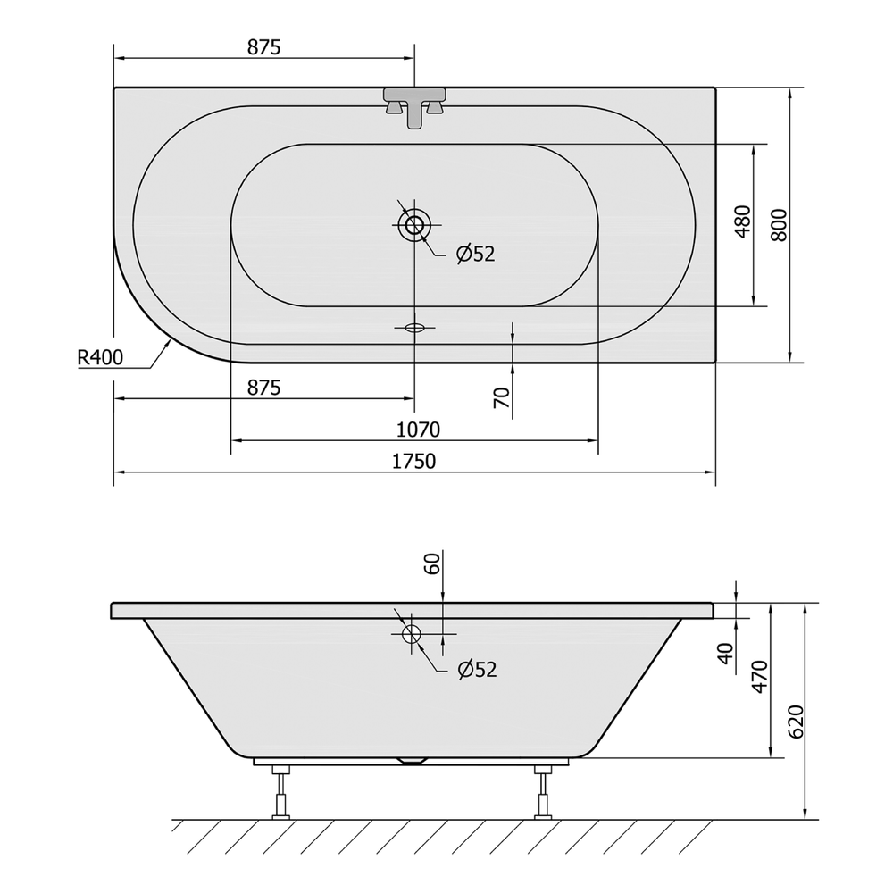 VIVA R 175 asymmetrische Badewanne 175x80x47cm, rechts, weiß