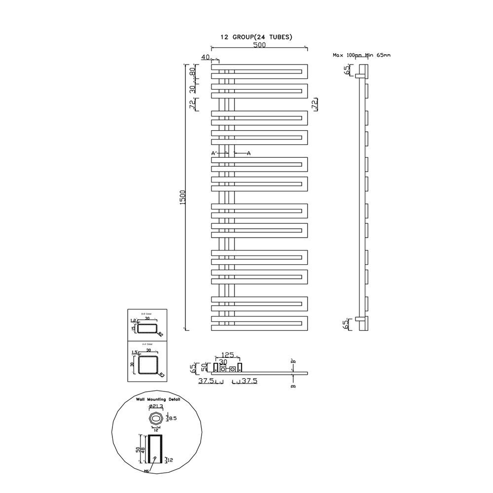 VOLGA Badheizkörper 500x1500mm, Edelstahl matt