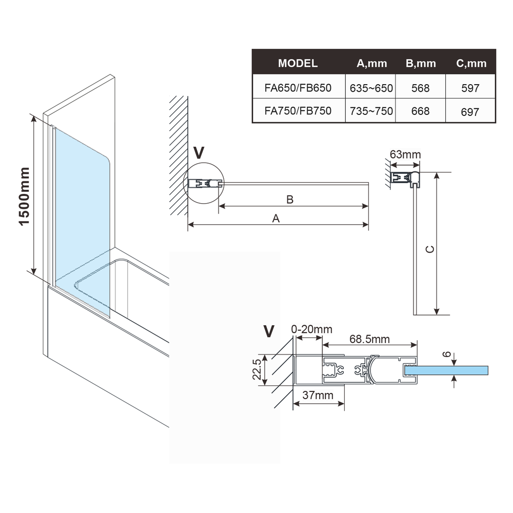 ROTA klappbar Wannenabtrennung 650mm, Klarglas