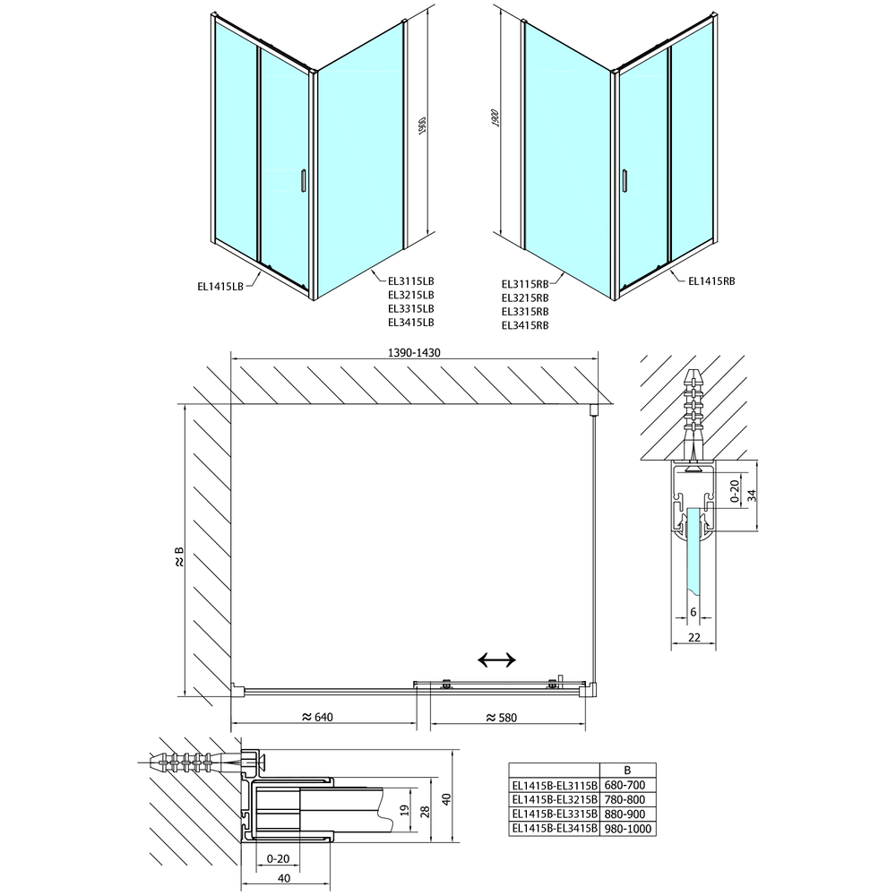 EASY BLACK Rechteckige Duschkabine 1400x700mm L/R Variante